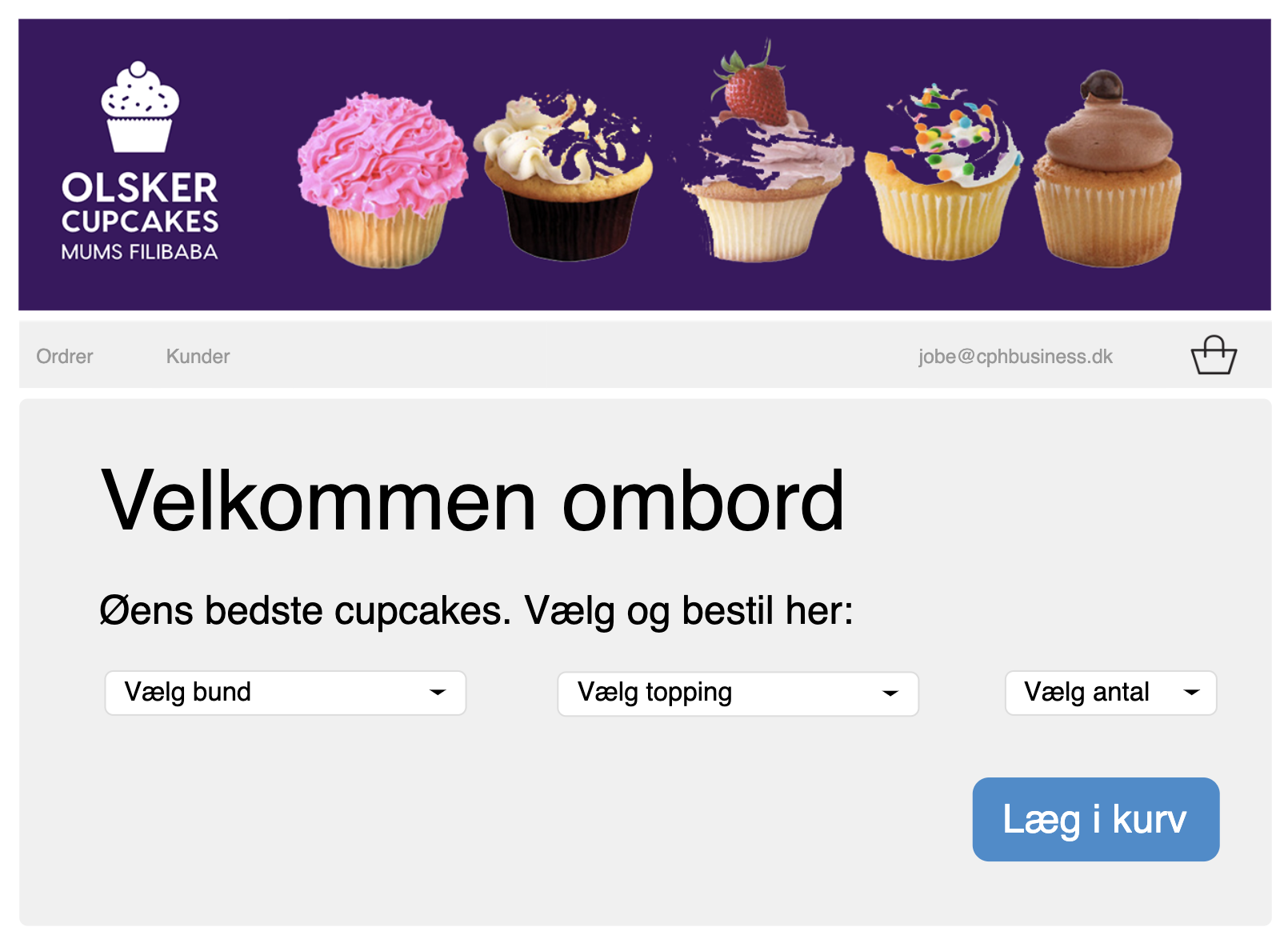 - Et kørende website, som løser Olsker Cupcakes behov. Vi har ikke lavet en virtuel maskine i skyen til at hoste vores website på nettet, så det er fint nok at I kan vise løsningen frem på jeres egen laptop.